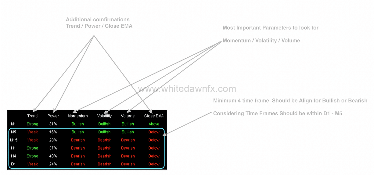 Before check anything else we must confirm that Momentum , Volatility and Volume is bearish or bullish minimum 4 time frames within 5 minute to Daily.