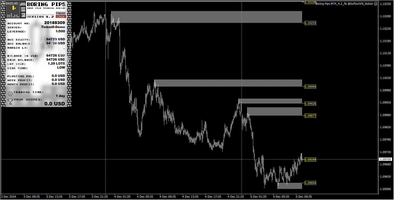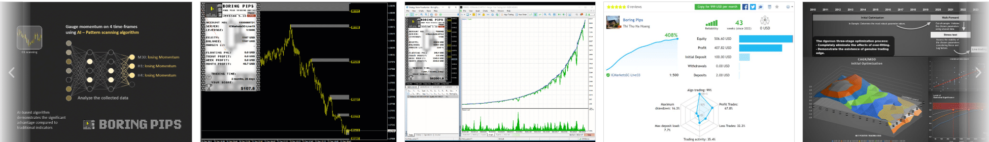 Boring Pips trading system is a blend of cutting-edge artificial intelligence algorithms and classic trading strategies involving: momentum, supply – demand zones and Fibonaci retracement. Specifically, the EA employs an advanced formula based on deep learning algorithms to simultaneously measure the momentum of prices across 4 time-frames. This analysis helps identify instances where synchronization in the decline of price momentum at potential supply and demand zones, enabling the system to make informed trading decisions. The entire process, from signal scanning to entering and exiting positions, is completely automated in 4 steps: