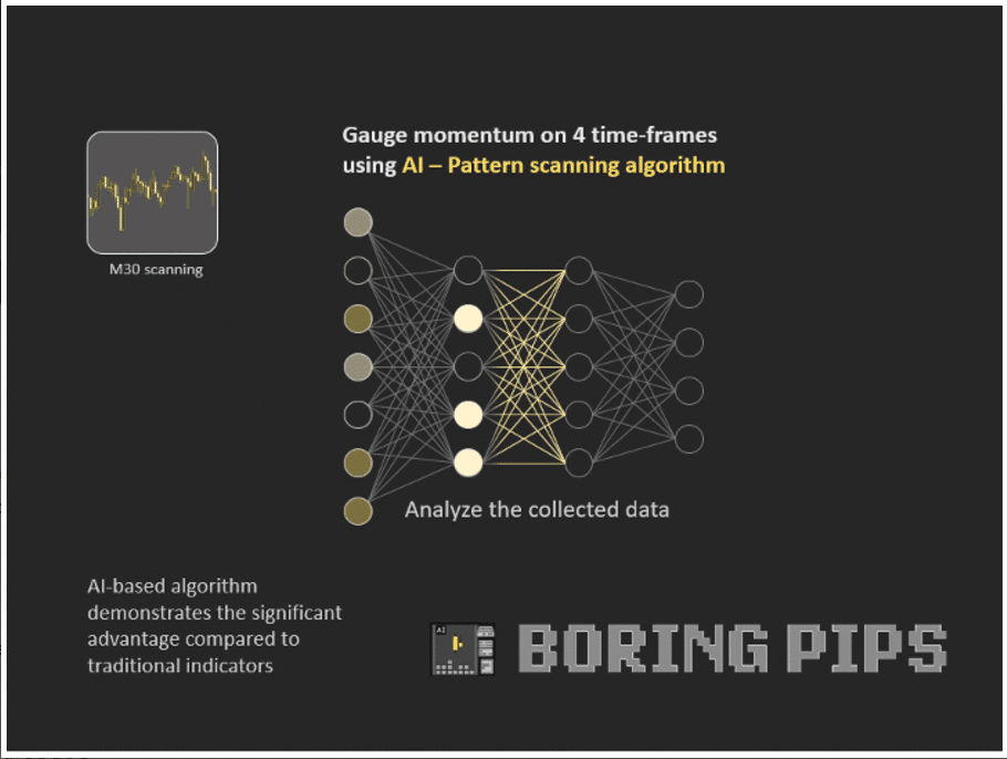 – Step 2: Boring Pips uses a sophisticated and unique algorithm created by artificial intelligence to detect any change in price momentum after a strong price movement across different time-frames.
