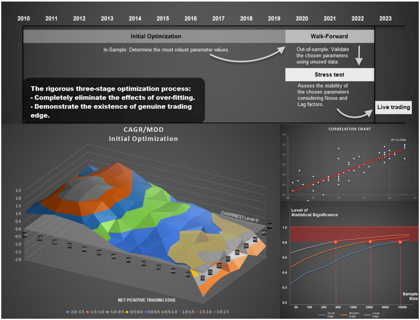 – Stress testing: Parameter values that pass the first two stages will undergo Stress testing. In this final test, a simulation algorithm is used to introduce variables like Noise and Lag to the initial entry and exit points (determined by the selected parameters from Walk-forward phase). The goal is to push the system beyond its ‘comfort zone’ and assess the system’s tolerance to random factors such as lag and noise.
