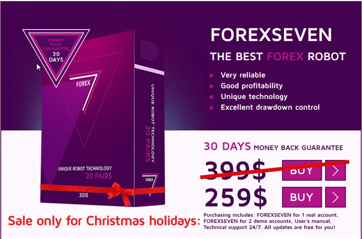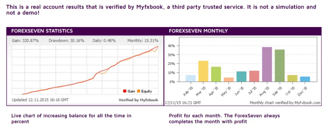 FOREXSEVEN is fully automated Forex system (robot). Our product is completely unique! Its can work on 20 currency pairs at once. This flexibility of FOREXSEVEN make possible to compensate all drawdowns, using profit on other currency pairs. When the sufficient total equity profit is reached, the system will close all trades with profit. This system very reliable and has special control of drawdown which will protect you against losses. Advisor uses a trading algorithm that allows you always close the orders with profit in the aggregate and most important – its not using principles of the Martingale! We achieve this by working with a great number of currency pairs.