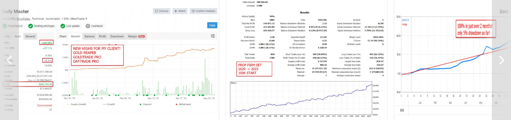 Gold trade Pro has 7 different strategies already build in, that work seamlessly together. The result is a very stable growth curve, with some losses here and there as well (but at least not manipulated to trick you.)