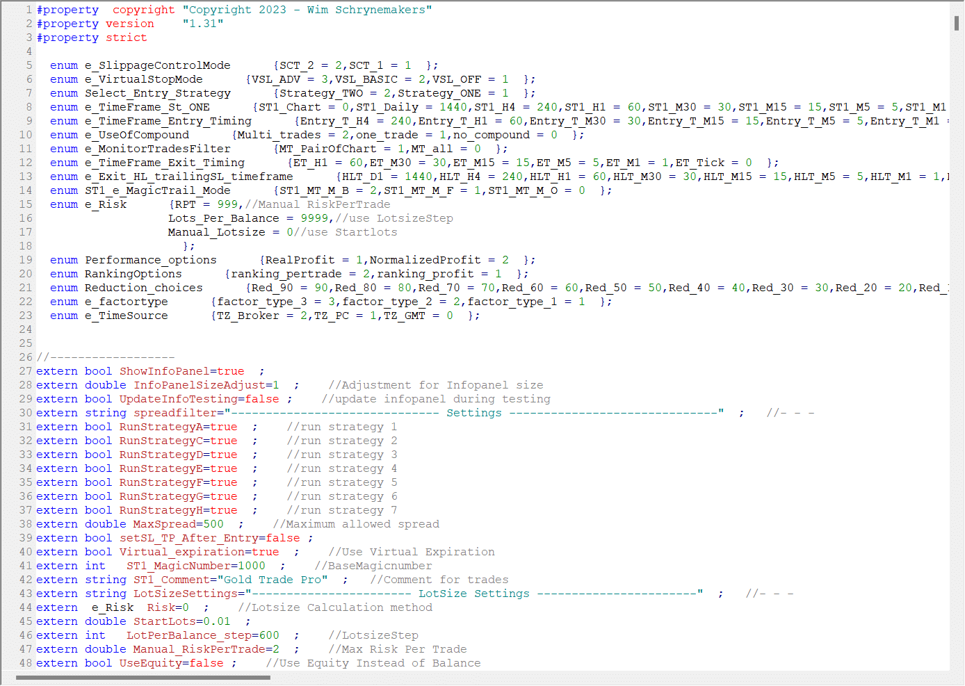 - Trading Strategies and Timeframes: The EA appears to be set up to run multiple strategies (at least seven, as indicated by the variables