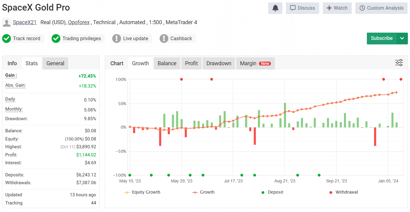 SpaceX Gold Pro is an Expert Advisor designed to automate trading on the Meta Trader 4 platform, specifically focusing on the XAUUSD (GOLD) pair with a time frame of M1. SpaceX Gold Pro a Max Drawdown of less than 2% using the recommended settings, it features automatic Take Profit (TP) and Stop Loss (SL) functionality. Compatible with all brokers, it operates without implementing Grid, Martingale, or High-Frequency Trading (HFT) strategies. Noteworthy is its ability to successfully navigate challenges from platforms like FTMO, FundedNext, Surge Trader, and various other companies.