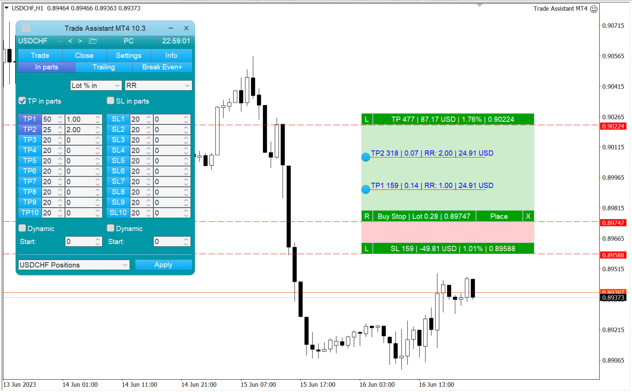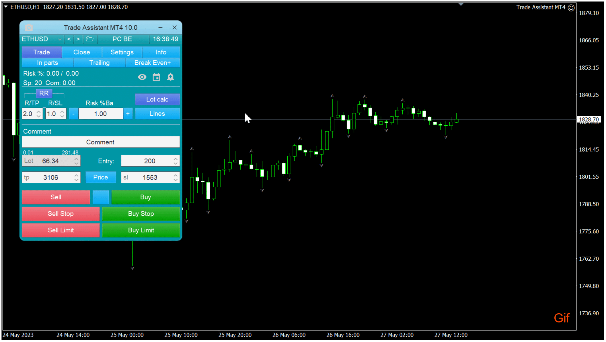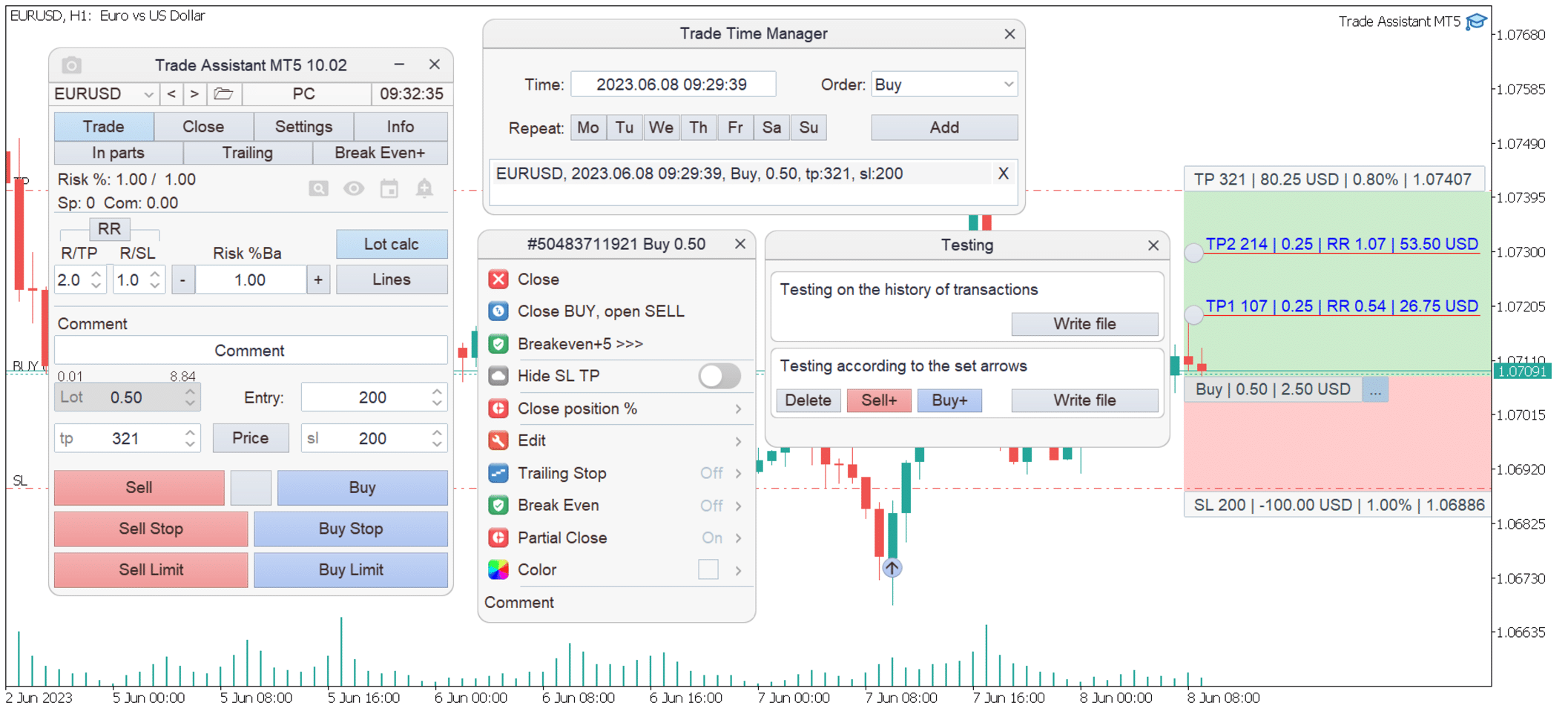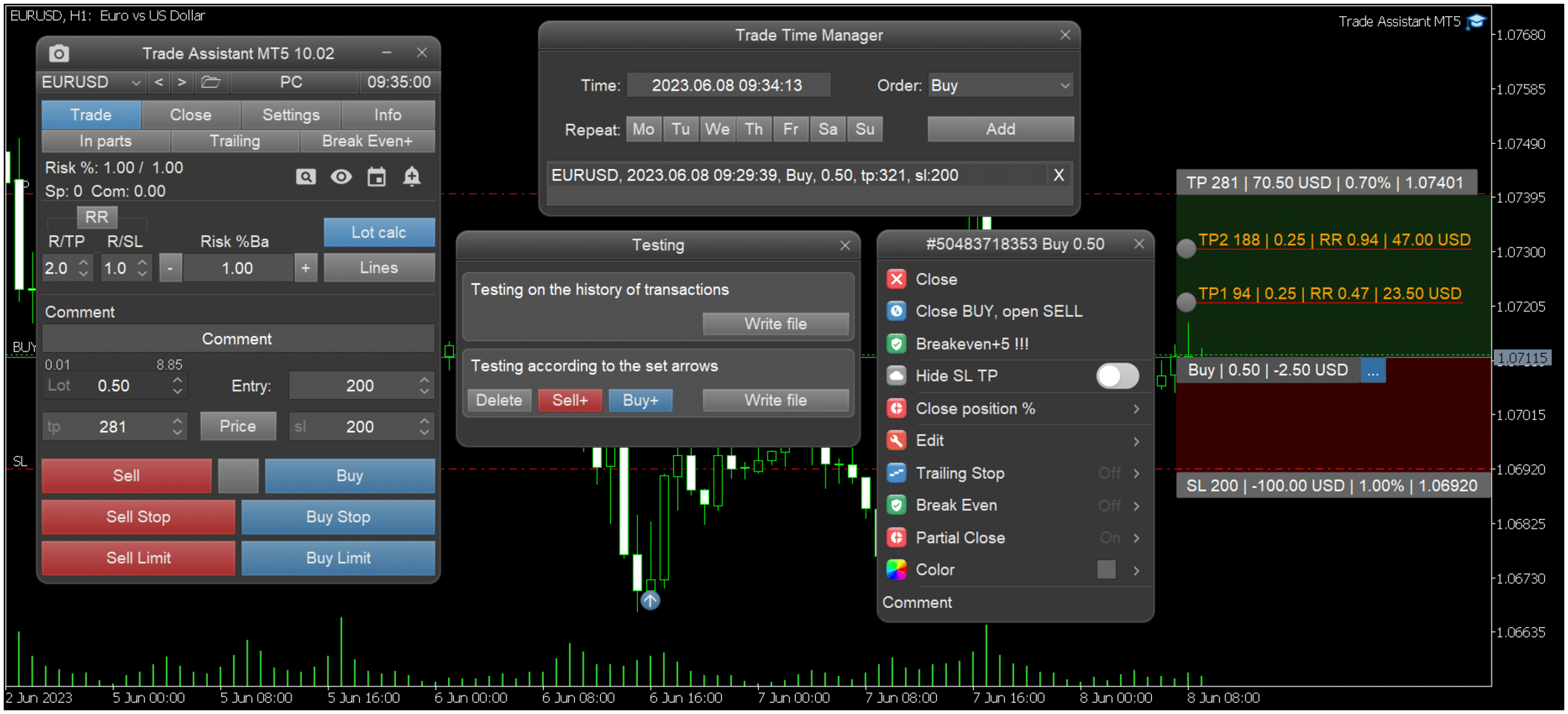 It helps to calculate the risk per trade, the easy installation of a new order, order management with partial closing functions, trailing stop of 7 types and other useful functions.